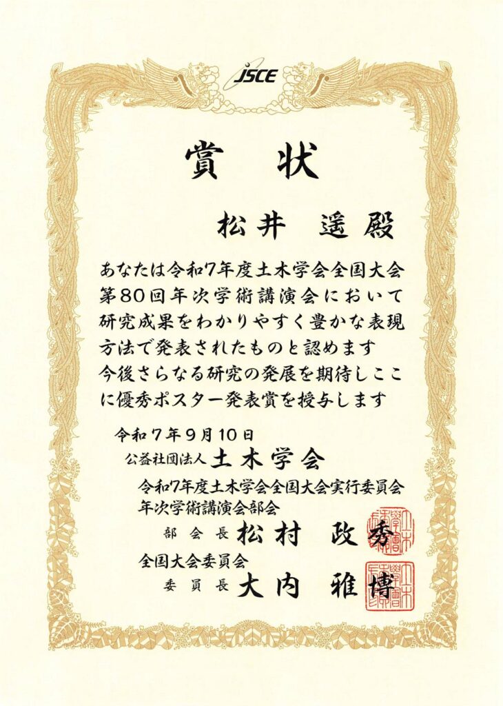 令和7年9月に開催された「令和七年度土木学会全国大会第80回年次学術講演会」にて、社会基盤デザインプログラムの松井遥さん(修士課程1年)が優秀ポスター発表賞を受賞しました。