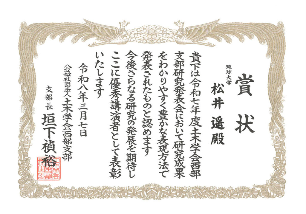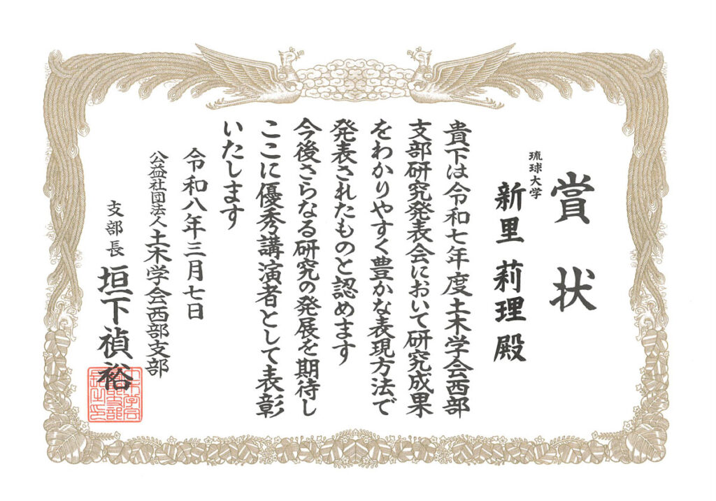 令和8年3月に九州産業大学で開催された「令和七年度土木学会西部支部研究発表会」にて、社会基盤デザインコースの新里莉理さん(学部4年)、社会基盤デザインプログラムの松井遥さん(修士課程1年)の2名が優秀講演者賞を受賞しました。